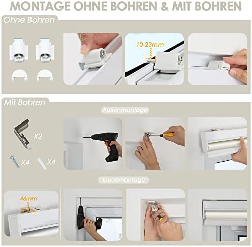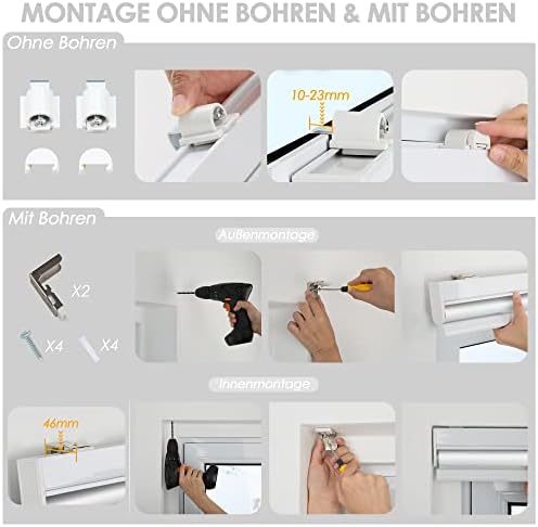 Dank des praktischen Klemmfix-Systems gelingt die Montage des Rollos ohne bohren. Die obere Stange ist aus robustem PVC gefertigt, während die untere Stange aus leichtem, aber stabilen Aluminium besteht. Dies gewährleistet eine einfache Handhabung und sorgt dafür, dass das Rollo an Fensterrahmen mit einer Stärke von 10-23 mm mühelos angebracht werden kann. Zudem sind zusätzliche Wandhalterungen für die Deckenmontage im Lieferumfang enthalten.