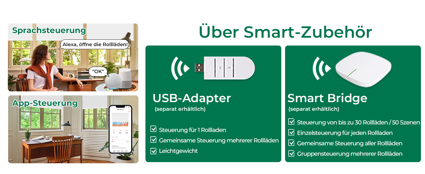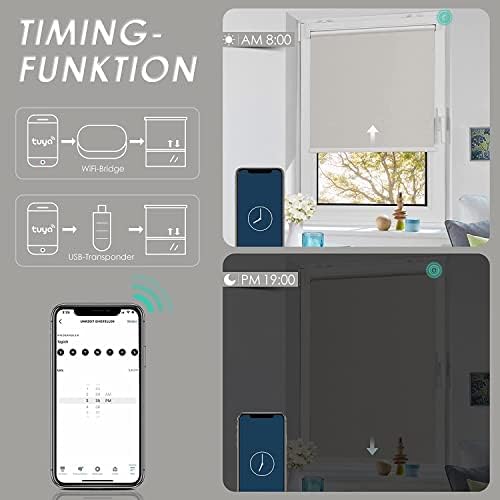 Darüber hinaus bieten wir das Rollo in 19 verschiedenen Farben und Breiten von 45 bis 200 cm sowie Höhen von 50 bis 250 cm an. So können Sie das Rollo ganz nach Ihren Vorstellungen und Bedürfnissen gestalten. Für technikaffine Nutzer bieten wir auch Optionen zur Sprachsteuerung über eine WiFi-Bridge oder Transponder an.