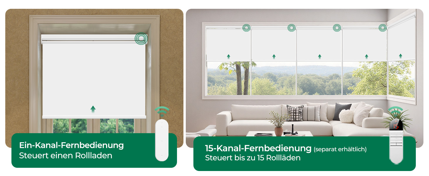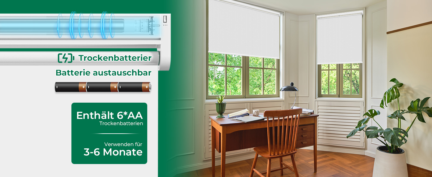 Die Bedienung unseres elektrischen Verdunklungsrollos ist bequem und unkompliziert. Es wird werkseitig mit einer Fernbedienung codiert, sodass Sie es sofort nach Erhalt in Betrieb nehmen können. Das Rollo wird von 6 vorinstallierten Trockenbatterien betrieben, die in der Regel alle 4-6 Monate ausgetauscht werden müssen. Dies bedeutet weniger Aufwand für Sie und mehr Zeit zum Entspannen.