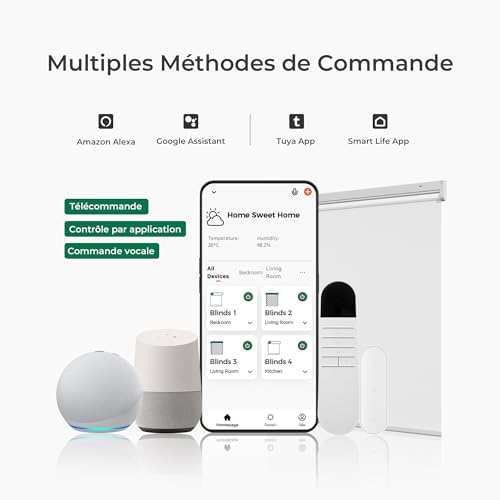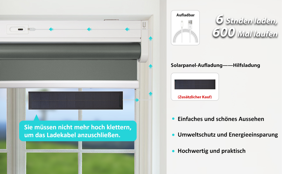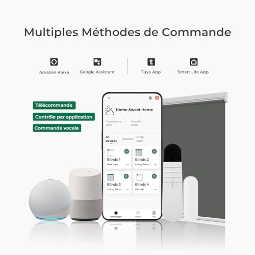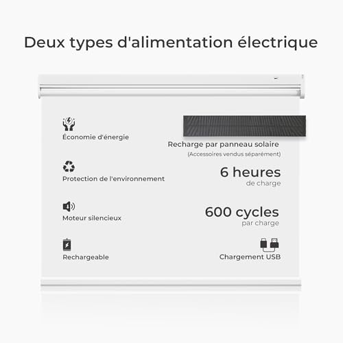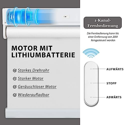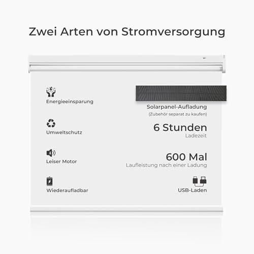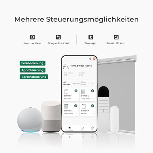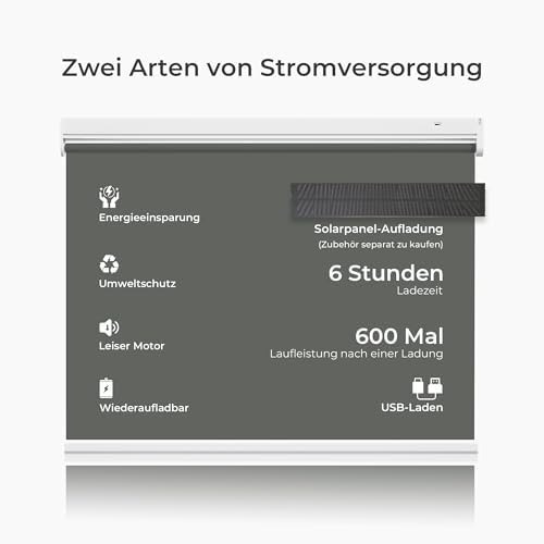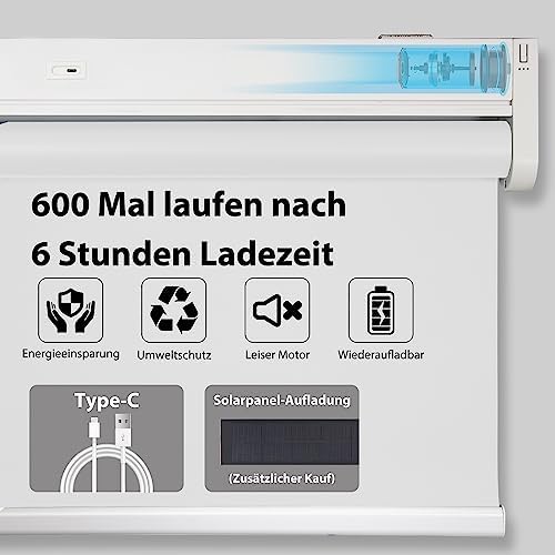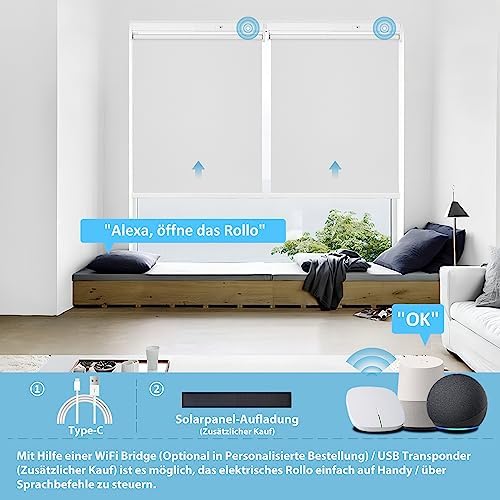 Der in das Verdunklungsrollo integrierte, leise Motor wurde werkseitig mit der Fernbedienung kodiert, sodass Sie das Rollo sofort nach dem Empfang in Betrieb nehmen können. Es ist wiederaufladbar und mit Alexa und Google Assistant kompatibel. Außerdem können Sie es bequem über Ihr Handy steuern.