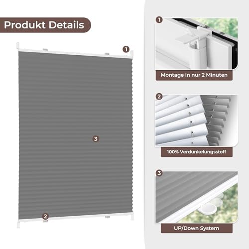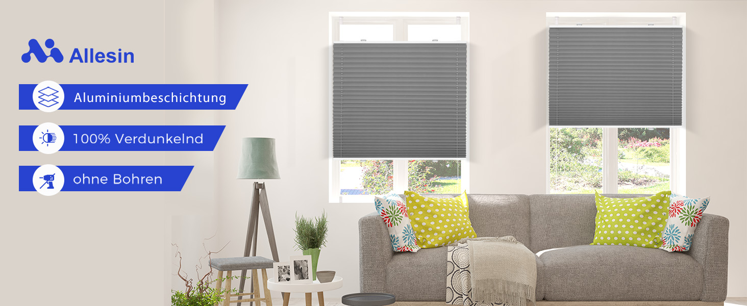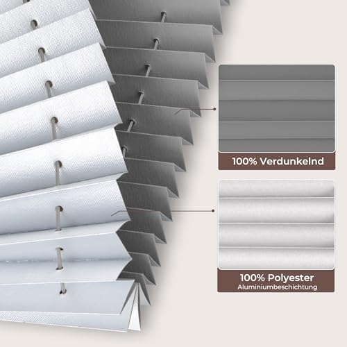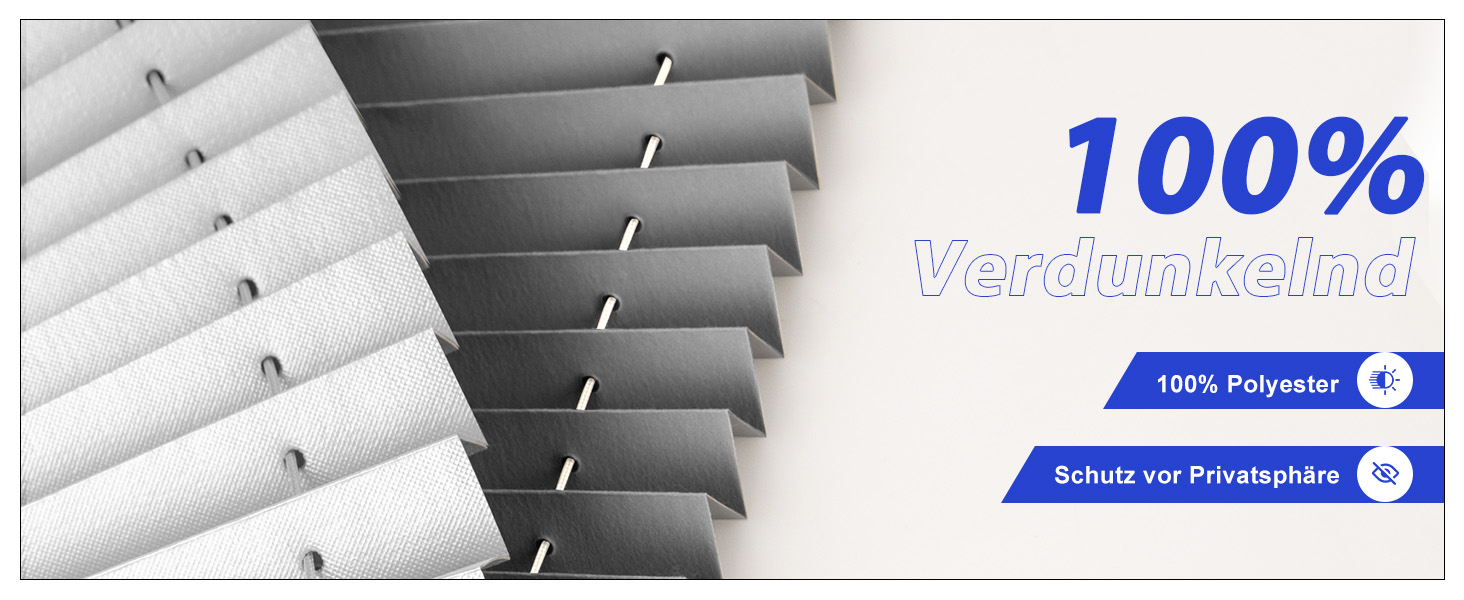 Die plissierten Verdunkelungsjalousien sind aus 100% Polyesterfaser gefertigt und verfügen über eine spezielle Aluminiumbeschichtung auf der Rückseite. Diese Technologie sorgt dafür, dass UV-Strahlen im Sommer effektiv blockiert werden, wodurch Ihr Raum vollständig abgedunkelt wird. In den Wintermonaten hält die Jalousie kalte Luft draußen und trägt dazu bei, Ihr Zuhause warm und gemütlich zu halten. Gleichzeitig bieten sie einen hervorragenden Sichtschutz, sodass Sie ungestört bleiben können.