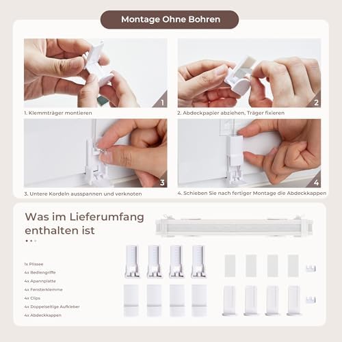 Die plissierten Jalousien können einfach an die Fensterflügel mittels vier verstellbarer Klemmhalterungen montiert werden, komplett ohne Bohren oder Schrauben. Dies spart Zeit und Mühe und schützt Ihre Wände vor Beschädigungen. Sie sind geeignet für Fensterrahmen mit einer Rabattenstärke von 10 mm bis 23 mm und lassen sich jederzeit problemlos entfernen und wieder installieren. Sollten Teile des Zubehörs im Lieferumfang beschädigt ankommen, zögern Sie nicht, uns für eine kostenfreie Ersatzlieferung zu kontaktieren.