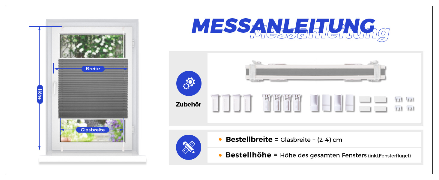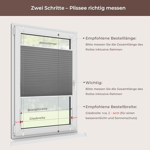 Bitte beachten Sie, dass die bestellte Breite der Verdunkelungsjalousien gleich der Breite des Glases plus 4 cm entsprechen sollte. Die Bestellhöhe ist die Gesamthöhe des Fensterrahmens. Beispiel: Bei einer Glasbreite von 71 cm sollten Sie 75 cm bestellen. Berücksichtigen Sie bei der Breitenbestimmung sämtliche Fenstergriffe oder andere hervorstehende Zubehörteile auf der linken und rechten Seite des Fensters. Beachten Sie bitte, dass ein Kürzen oder Schneiden der plissierten Jalousien nicht gestattet ist.