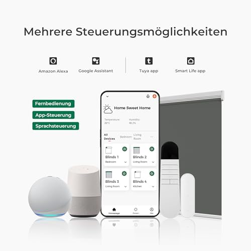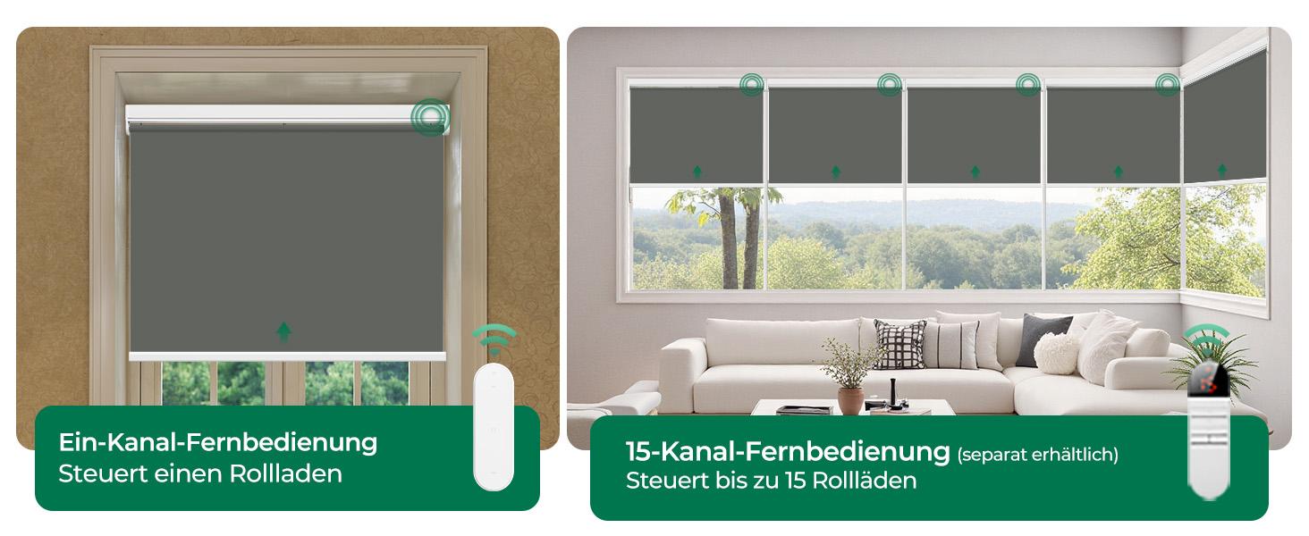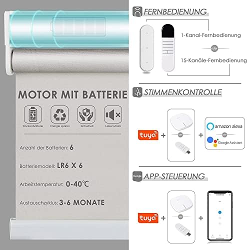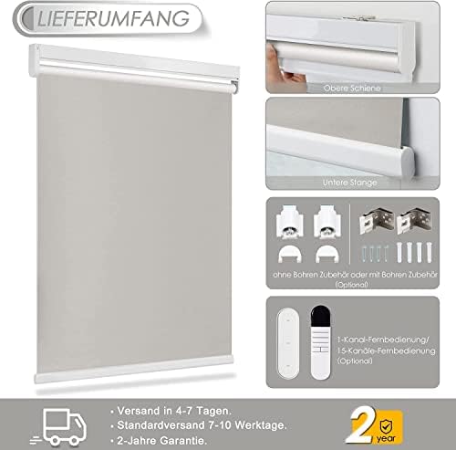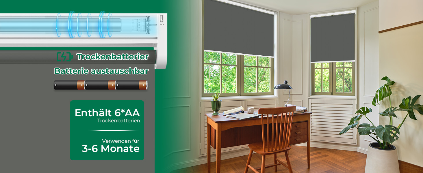 Erleben Sie maximalen Komfort mit der im Lieferumfang enthaltenen Fernbedienung. Das Verdunklungsrollo wird bereits werkseitig codiert, sodass Sie es nach Empfang sofort in Betrieb nehmen können. Angetrieben von 6 vorinstallierten Trockenbatterien, die nur alle 4-6 Monate ausgetauscht werden müssen, steht einer mühelosen Nutzung nichts im Wege.