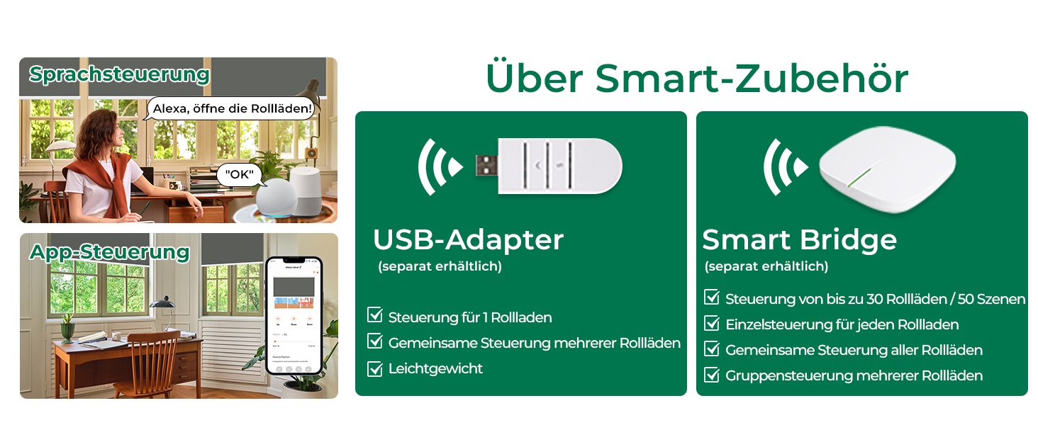 Wählen Sie aus 19 verfügbaren Farben und individuellen Breiten von 45 cm bis 200 cm sowie Höhen von 50 cm bis 250 cm. Für zusätzlichen Komfort bieten wir auch Smart Home Lösungen an, mit Sprachsteuerung über WiFi-Bridge oder Transponder.