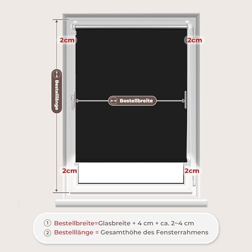 Beachten Sie, dass die Stoffbreite des Rollos ca. 4 cm kürzer ist als das angegebene Maß, um eine optimale Passform zu gewährleisten. Die Bestellbreite entspricht der Scheibenbreite plus 4 cm, während die Bestellhöhe von der Oberkante des Rahmens bis zur Unterkante reicht. Wir empfehlen, immer die nächstgrößere Länge zu wählen. Der überschüssige Stoff bleibt einfach aufgerollt und muss nicht gekürzt werden.
