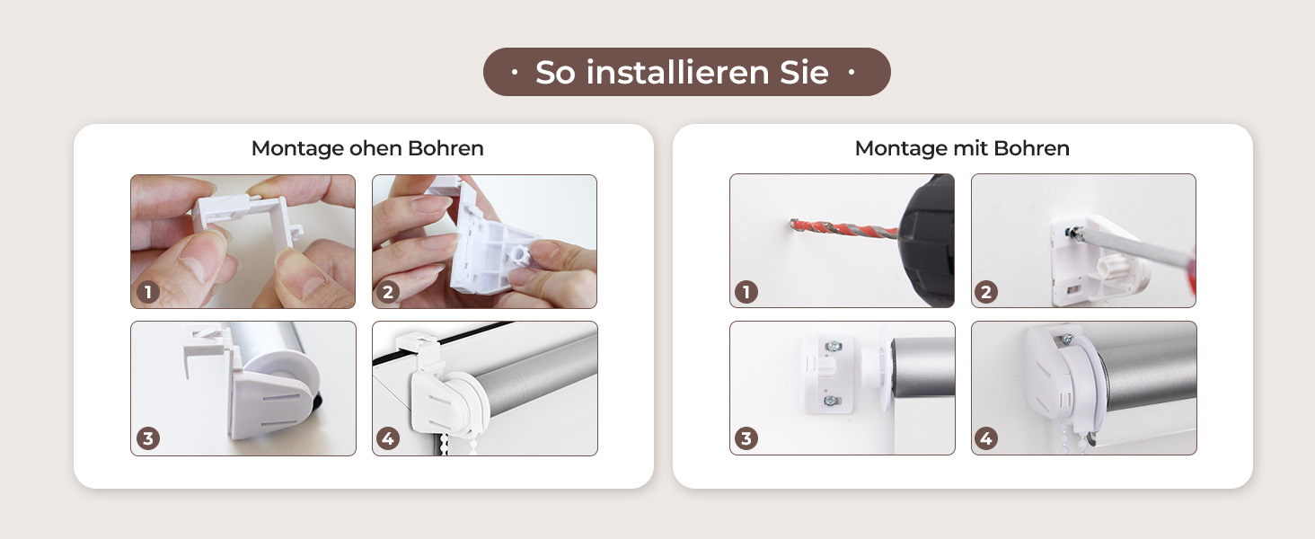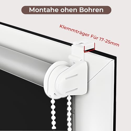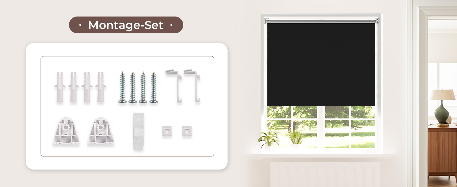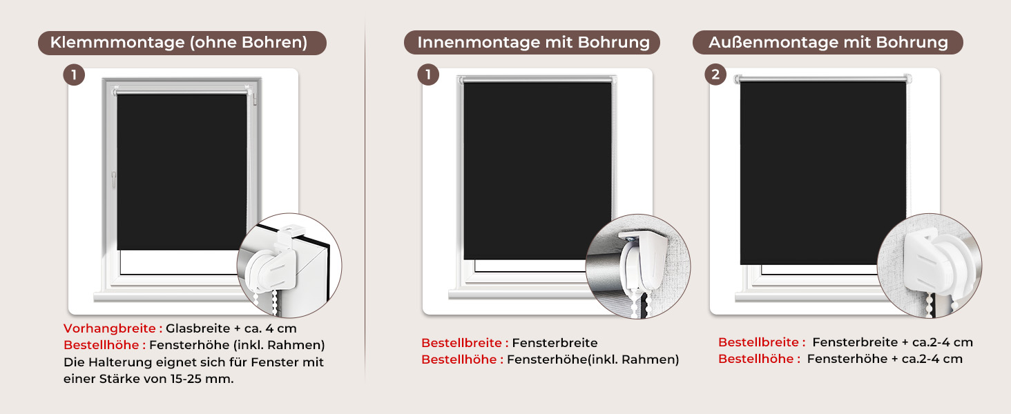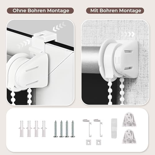 Die Montage erfolgt ganz ohne Bohren! Dank der innovativen Klemmfix-Halterungen kann das Rollo einfach am Fensterrahmen befestigt werden. Diese Halterungen sind individuell auf Rahmenbreiten von 17 mm bis 25 mm anpassbar, sodass das Rollo bei Bedarf problemlos abgenommen und ohne Rückstände an einem anderen Fenster wieder angebracht werden kann. Für eine festere Installation können die Halterungen auch mit dem mitgelieferten Schrauben und Dübel an Wand, Decke oder Fensterrahmen montiert werden.