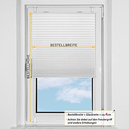 Um sicherzustellen, dass Ihr Plisseerollo perfekt passt, beachten Sie bitte unsere Hinweise zur Größenbestellung: Die Bestellbreite sollte der Glasbreite plus 2-4 cm entsprechen. Die Bestellhöhe ist die Höhe des gesamten Fensterrahmens. Beispiel: Bei einer Glasbreite von 81 cm könnte die Bestellung 85 cm (81+2+2) betragen. Vergessen Sie dabei nicht, Fenstergriffe oder andere überstehende Beschläge bei der Breitenwahl zu berücksichtigen.