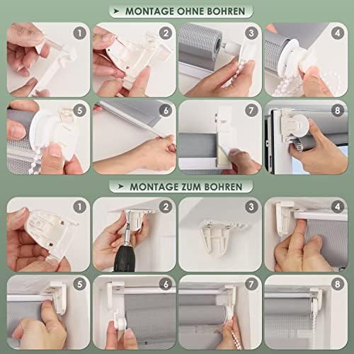 Ob ohne Bohren oder mit Bohren – mit unserem Klemmfix Doppelrollo passen Sie die Montagemethoden ganz nach Ihren Wünschen an. Die Klemmfix Halterungen sind perfekt für Fensterrahmen mit einer Breite von 18-25 mm geeignet und lassen sich mühelos anbringen. Für eine festere Installation können Sie die mitgelieferten Zubehörteile nutzen und das Rollo an der Wand montieren. Diese Flexibilität macht es einfach, das Rollo genau nach Ihren Bedürfnissen zu installieren.