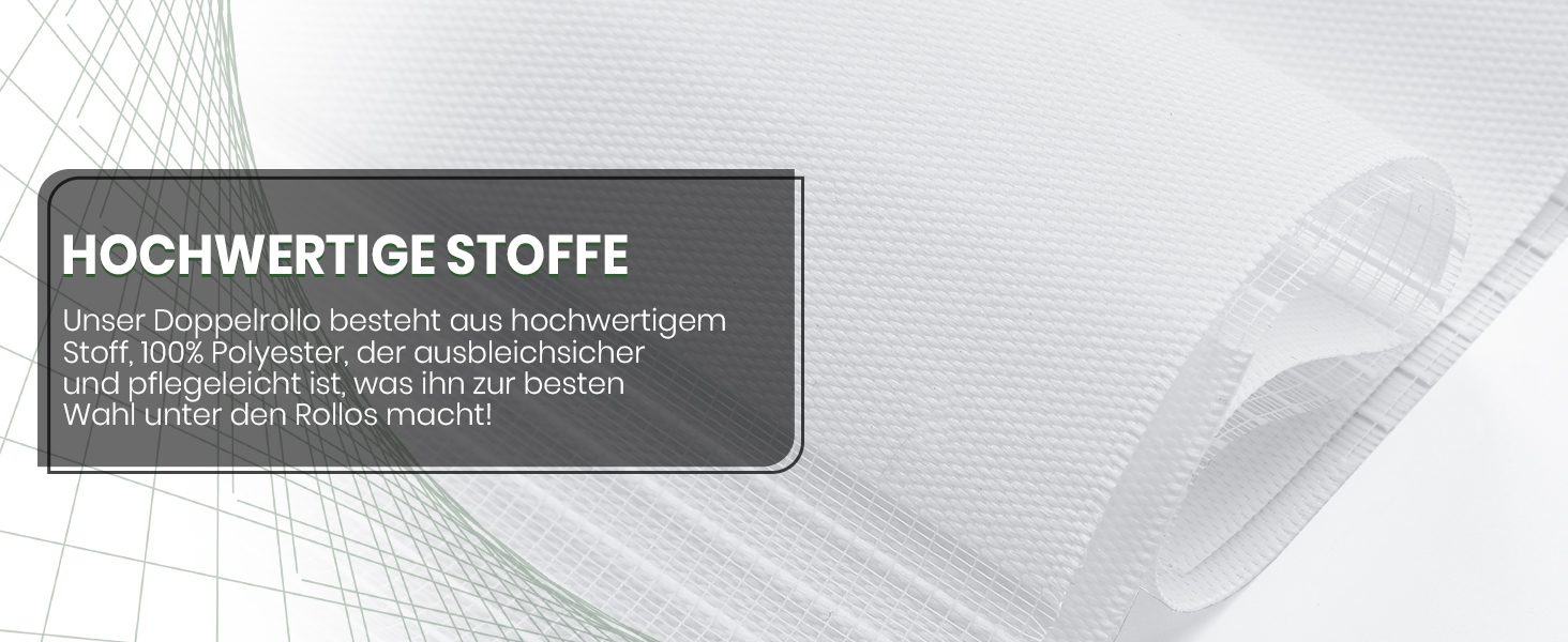 Unser Doppelrollo Klemmfix besteht aus 100% Polyester, das nicht nur für seine Langlebigkeit bekannt ist, sondern auch leicht zu reinigen ist. Mit einem einfachen Wisch mit einem feuchten Tuch entfernen Sie Staub und Schmutz mühelos. Das spezielle Gewebe wird zudem durch Laserschneiden bearbeitet, wodurch Abrieb und Fusselbildung nach längerem Gebrauch erheblich reduziert werden.