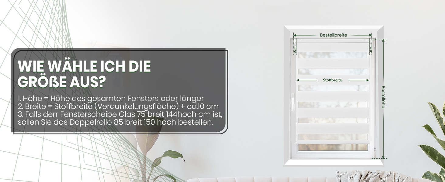 Um sicherzustellen, dass das Rollo perfekt an Ihr Fenster passt, beachten Sie bitte die Bestellhinweise: Die Breite des Rollostoffs sollte 4 cm breiter sein als die Glasbreite. Für eine vollständige Abdeckung des Fensters empfehlen wir, die Bestellbreite mindestens 8 cm breiter zu wählen. Achten Sie auch darauf, dass der Stoff die Fenstergriffe nicht verdeckt. Beispielsweise empfehlen wir bei einer Fenstergröße von 60 x 140 cm das Rollo in der Größe 70 x 150 cm.