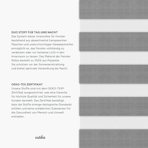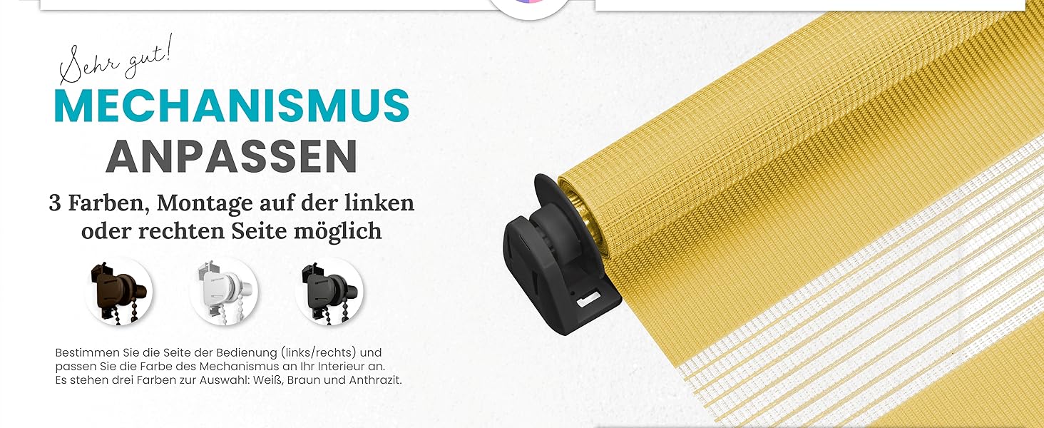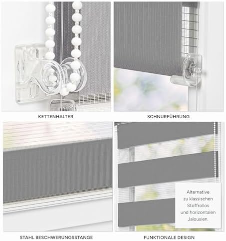 Der verwendete Stoff verfügt über eine einzigartige Struktur mit abwechselnden Voll- und Netzstreifen, die sowohl das Verdunkeln als auch das Hereinlassen von Licht ermöglichen. Diese Funktion macht unser Rollo nicht nur vielseitig, sondern sorgt auch für eine angenehme Atmosphäre in Ihrem Raum. Die Reinigung gestaltet sich ebenfalls einfach – wischen Sie das Rollo einfach mit einem feuchten Tuch ab.
