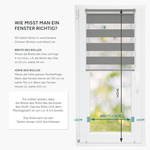 Um die ideale Rollogröße auszuwählen, messen Sie einfach die Scheibenbreite und addieren Sie 2 bis 4 cm. Für die Höhe messen Sie die gesamte Fensterhöhe: Ist sie größer als 150 cm, entscheiden Sie sich für die 220 cm Variante, um einen perfekten Sitz zu gewährleisten.
