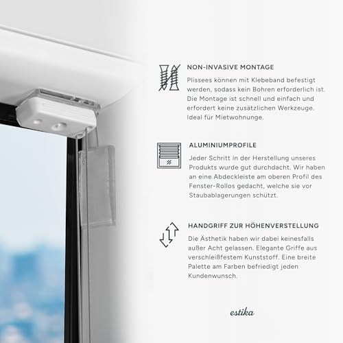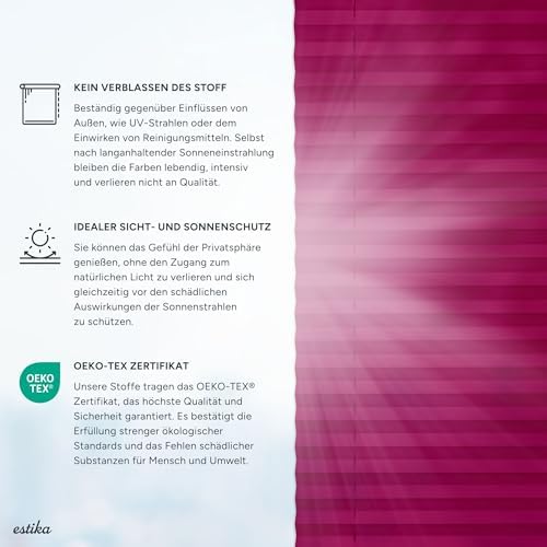 Der Plissee-Stoff ist blickdicht und sorgt für eine angenehme Lichtregulierung, da er eine leichte Abdunkelung des Raumes ermöglicht. Er ist OEKO-TEX-zertifiziert, was bedeutet, dass er schadstoffgeprüft und unbedenklich für Ihre Gesundheit ist. Zudem ist der Stoff farbbeständig und pflegeleicht – mit einem feuchten Tuch reinigen Sie im Handumdrehen.