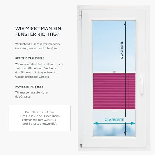 Unsere Plissee-Rollos sind die perfekte Lösung für jede Fenstergröße. Sie können zwischen Breiten von 30 cm bis 130 cm und Höhen von 50 cm bis 149 cm wählen. Mit nur wenigen Schritten können Sie das ideale Fensterrollo für Ihr Zuhause konfigurieren. Messen Sie einfach die Breite und Höhe Ihrer Fensterscheibe, inklusive der schwarzen Dichtung am Glasrand, und geben Sie die Maße in unseren Konfigurator ein.