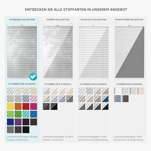 Wählen Sie aus einer beeindruckenden Palette von 23 verschiedenen Farben. Unsere selbstklebenden Plissees sind passend für alle Räume, sei es Wohnzimmer, Schlafzimmer, Kinderzimmer oder Büro. Damit schaffen Sie nicht nur Sichtschutz, sondern prägen auch die Atmosphäre Ihres Raumes.