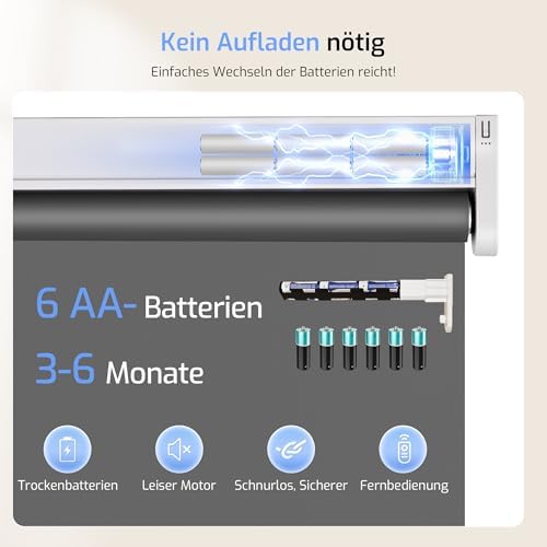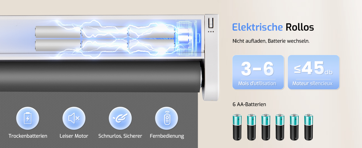 • Stromversorgung ohne Ladeaufwand: Nutzung von herkömmlichen Trockenbatterien (6AA), die leicht zu wechseln sind, sorgt für stets einsatzbereite Rollos.