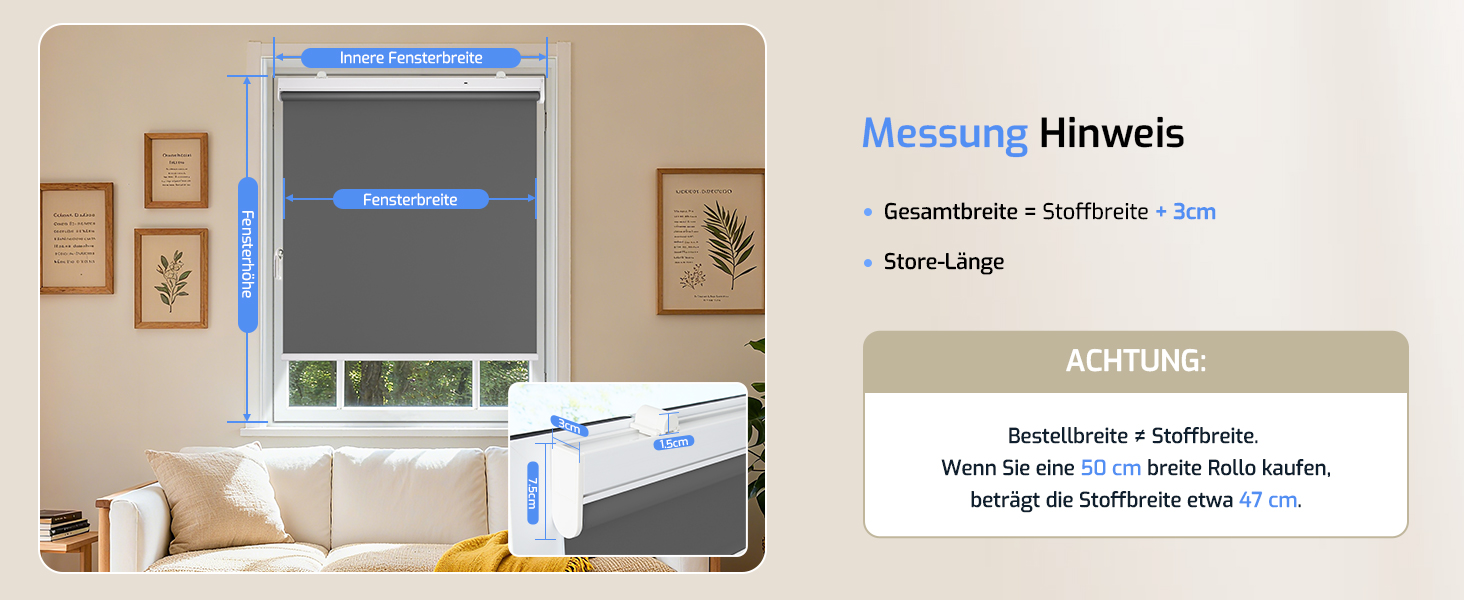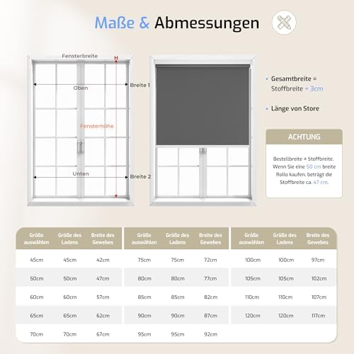 Messen Sie die Glasbreite vor dem Kauf, um sicherzustellen, dass Ihr Rollo perfekt passt. Die Bestellbreite sollte ca. 3 cm breiter als die Stoffbreite gewählt werden. Für Fensterrahmen mit einer Falzstärke von 1,5 bis 2,3 cm geeignet, ist das Rollo nicht für Dachfenster konzipiert.