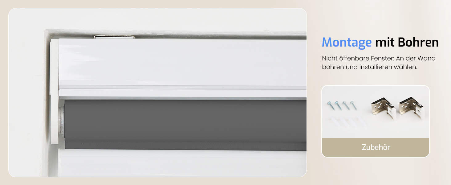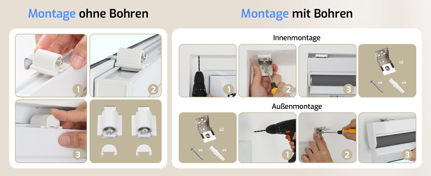 Das Rollo kann auf verschiedene Arten montiert werden: ob mit Bohren an der Decke oder Wand oder durch eine Klemmfix-Montage ohne Bohren am Fensterrahmen. Alle notwendigen Zubehörteile sind im Lieferumfang enthalten, sodass die Montage im Handumdrehen erledigt ist.