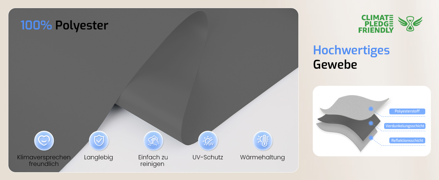 • Hochwertiges Material: Umweltfreundliches 300D Polyester schützt vor Sonne und bietet effektiven Sichtschutz – ideal für Klimaregulierung im Innenraum.