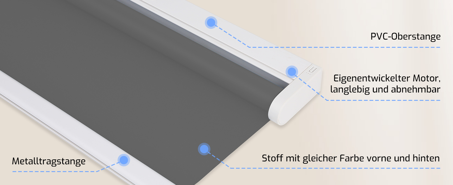 Jeder Motor des Rollos wird werkseitig eingestellt, sodass der Auf- und Abwärtspunkt genau definiert ist. Dadurch wird eine Überlastung des Motors verhindert. Bei Bedarf können Sie im Handbuch die entsprechenden Einstellungen für Ihre individuellen Wünsche vornehmen.