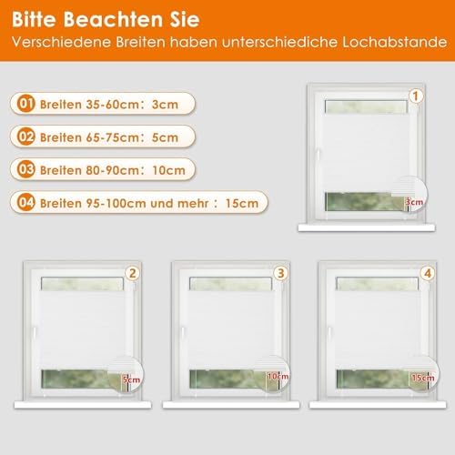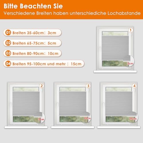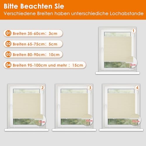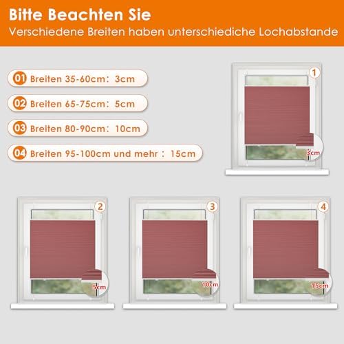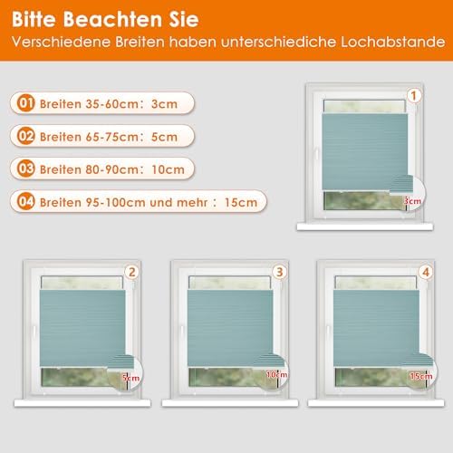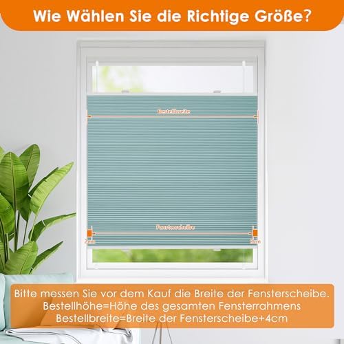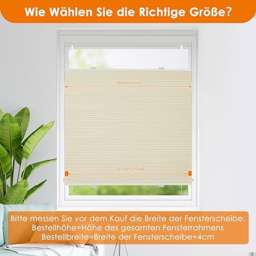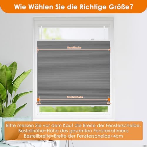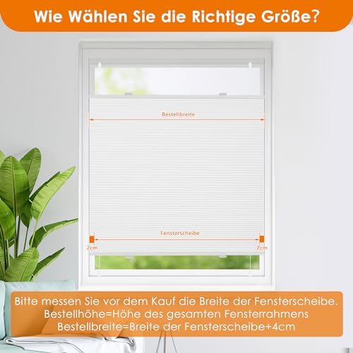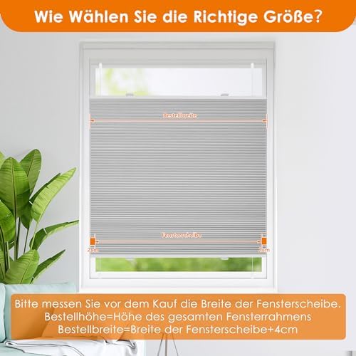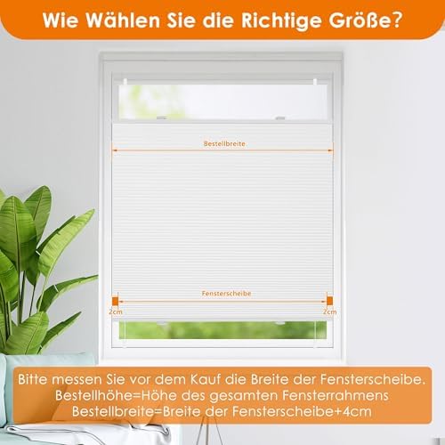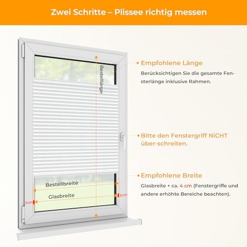 Um das ideale Plissee für Ihre Fenster zu finden, messen Sie bitte vor dem Kauf die Breite der Fensterscheibe. Wir empfehlen, die Glasbreite um 4 cm zu erhöhen, um einen besseren Schattierungseffekt zu erzielen. Bei einer Fensterscheibe von beispielsweise 76 cm ist ein 80 cm breites Produkt bestens geeignet. Achten Sie darauf, dass die bestellte Länge nicht kleiner ist als die Gesamtlänge Ihres Fensters.
