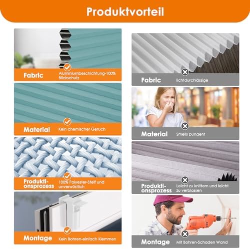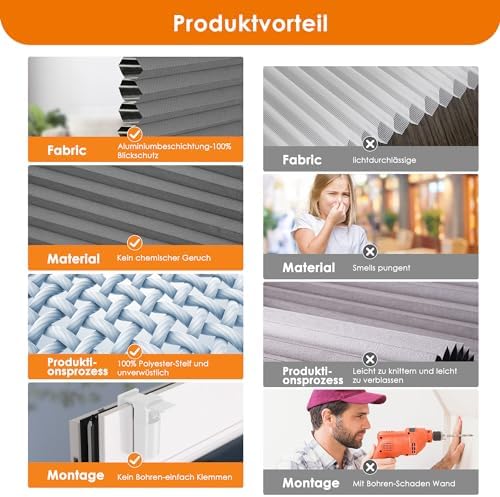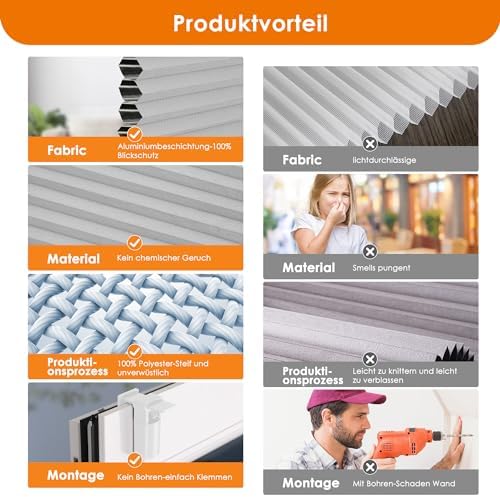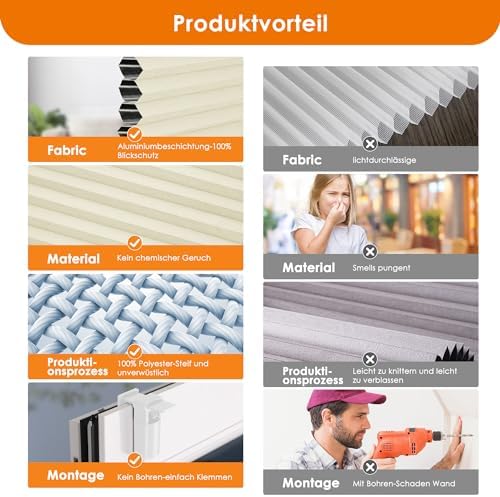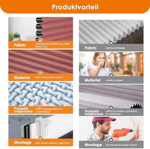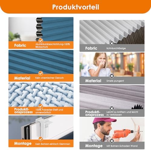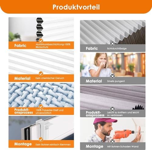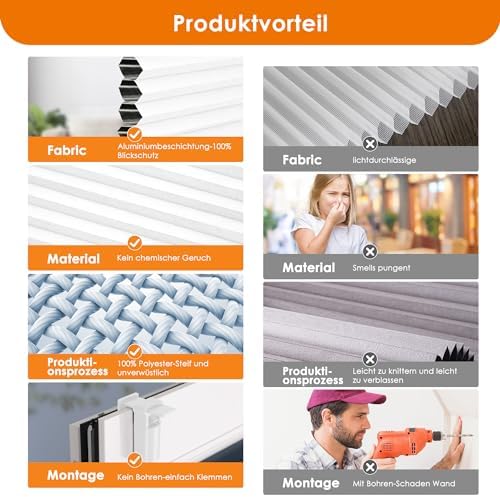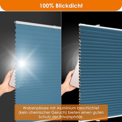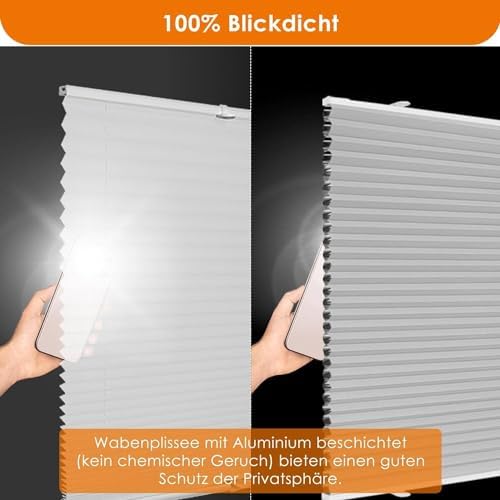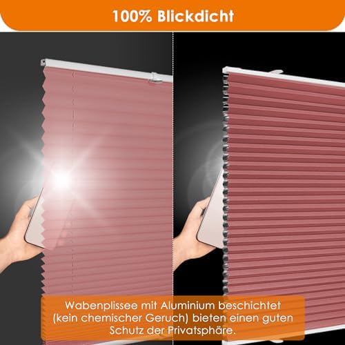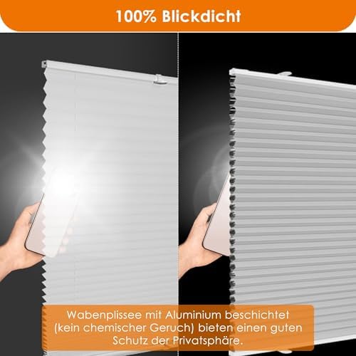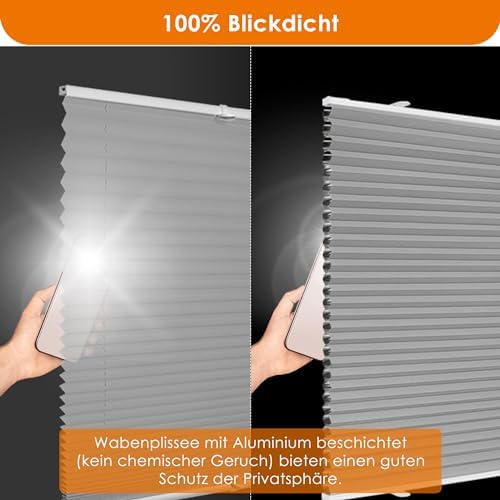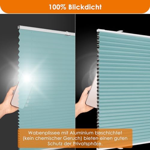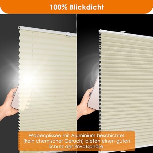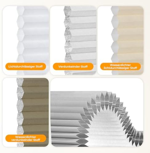Hergestellt aus 100% Polyester, ist unser Wabenplissee besonders pflegeleicht. Der Stoff lässt sich mühelos mit einer weichen Bürste oder einem feuchten Tuch reinigen, was ihn zur idealen Wahl für feuchte Umgebungen wie Keller, Badezimmer oder Küchen macht. Genießen Sie die Vorteile eines Materials, das sowohl funktional als auch ästhetisch anspricht.