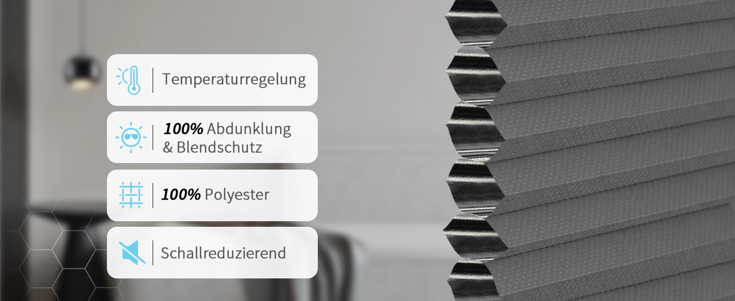 Unser Wabenplissee bietet weit mehr als nur Sichtschutz. Die doppelte Membranstruktur wirkt effektiv als Wärmeschutz im Winter und als Wärmedämmung im Sommer. Dadurch helfen Sie nicht nur der Umwelt, sondern senken auch Ihre Energiekosten. Außerdem sorgt die spezielle Wabenstruktur für eine spürbare Geräuschreduzierung – genießen Sie ruhige Räume ohne störende Geräusche von außen.