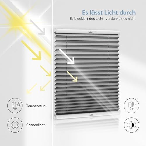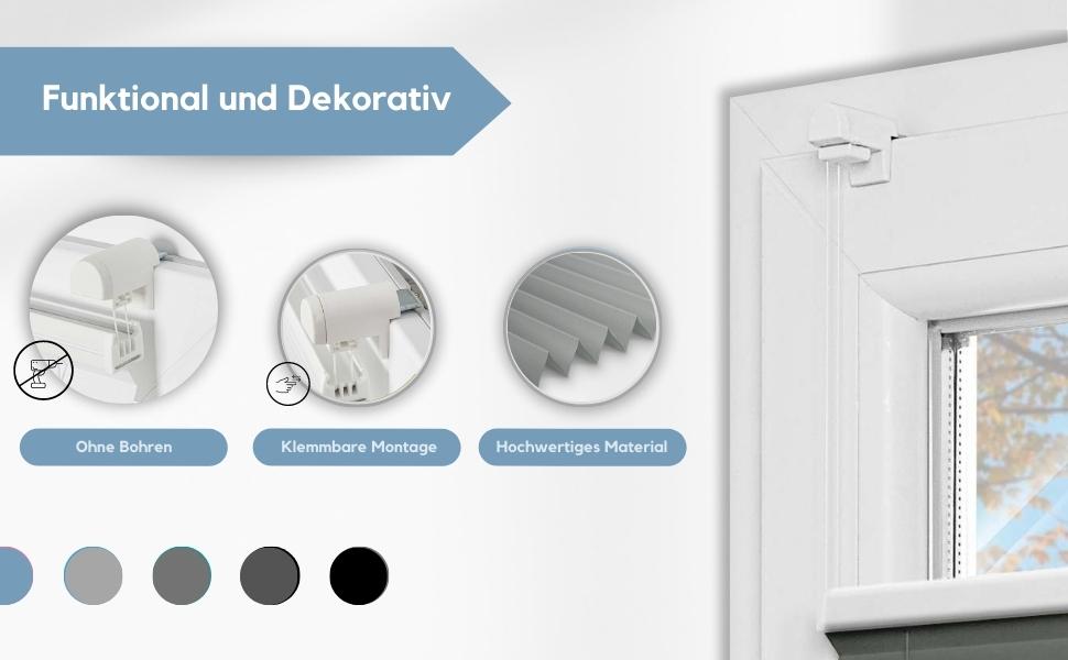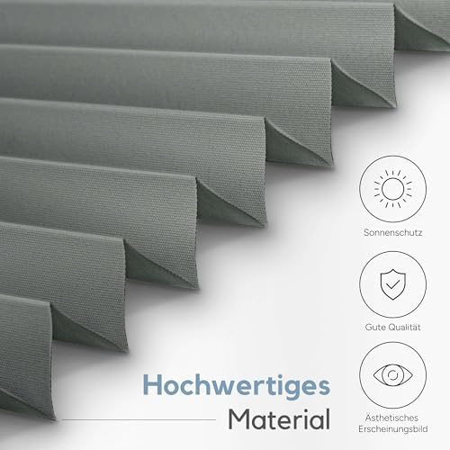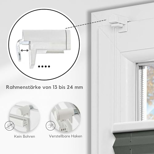Dank des innovativen Klemmfix Systems ist die Montage der Plissees kinderleicht und erfordert keinerlei Bohren oder zusätzliche Werkzeuge. Die Rollos hinterlassen keine bleibenden Spuren an Ihren Fenstern und sind somit ideal für Mietwohnungen. Sie sind für Fensterrahmen mit einer Breite von 14 bis 23 mm geeignet und lassen sich einfach und schnell anpassen.