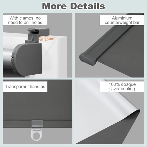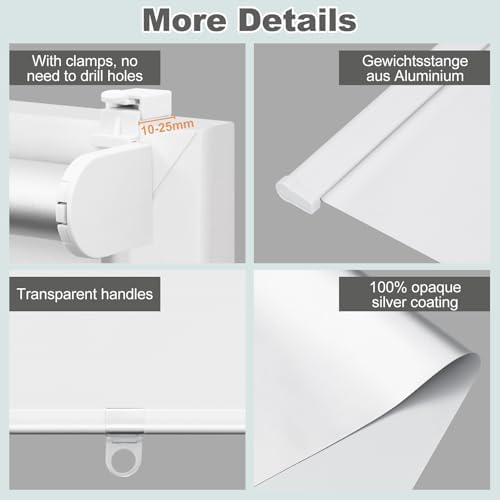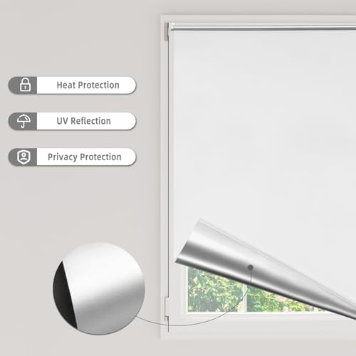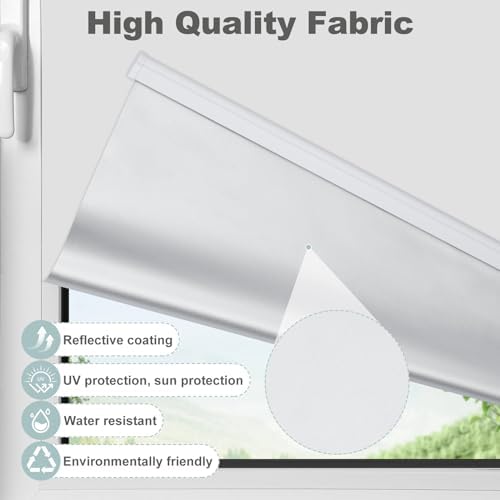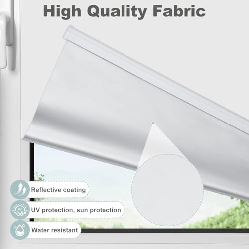 Das Rollo besteht aus strapazierfähigem und blickdichtem Polyester. Die spezielle silberne Beschichtung sorgt nicht nur für Langlebigkeit und Reißfestigkeit, sondern macht es zudem feuchtigkeitsbeständig und leicht abwischbar. Dadurch eignet sich unser Rollo perfekt für den Einsatz in feuchten Umgebungen wie Küchen oder Bädern.