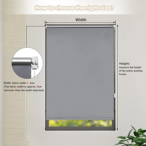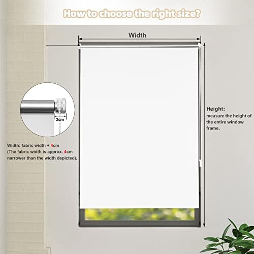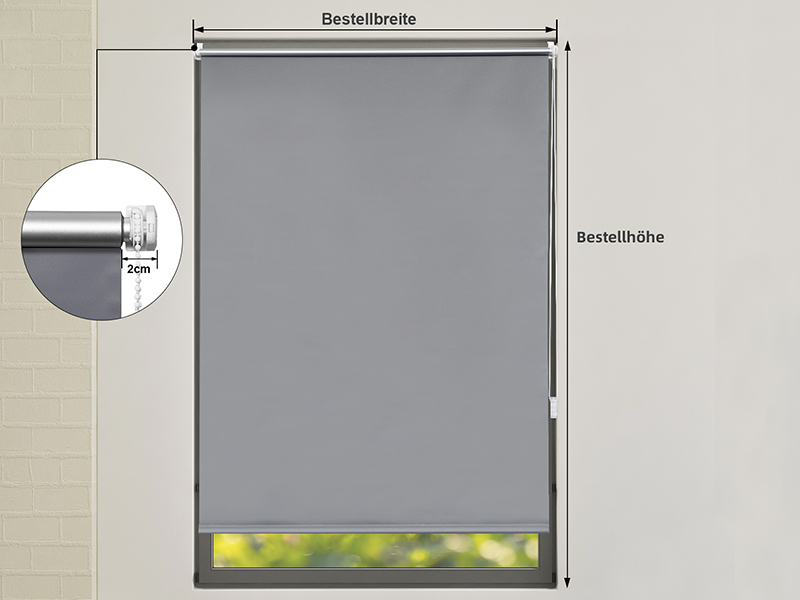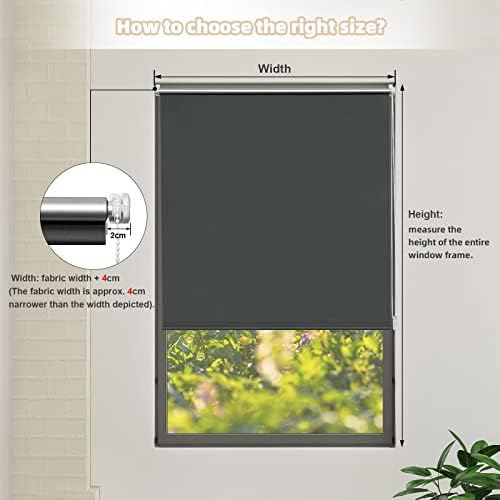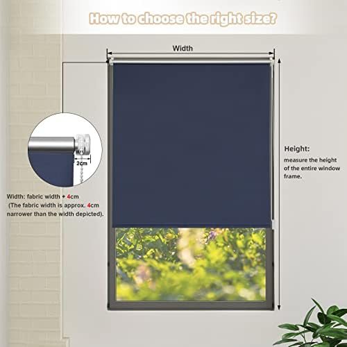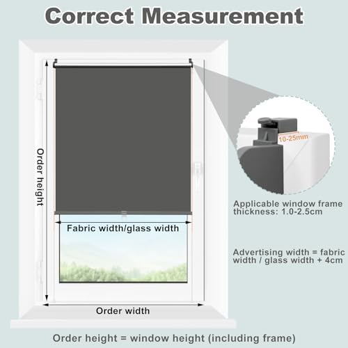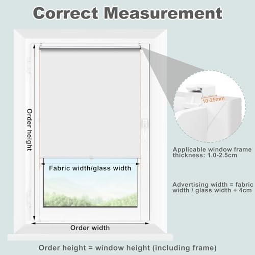 Um die perfekte Größe für Ihr Fenster zu finden, empfehlen wir Ihnen, die Breite des Fensterglases vor der Bestellung zu messen. Bitte beachten Sie, dass das Rollo mit Zubehör geliefert wird, wodurch die Breite des Verdunkelungsstoffes etwa 4 cm schmaler ist als die Gesamtbreite des Rollos. Für optimale Verdunklungsergebnisse empfehlen wir eine größere Produktbreite.