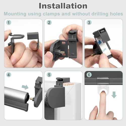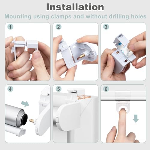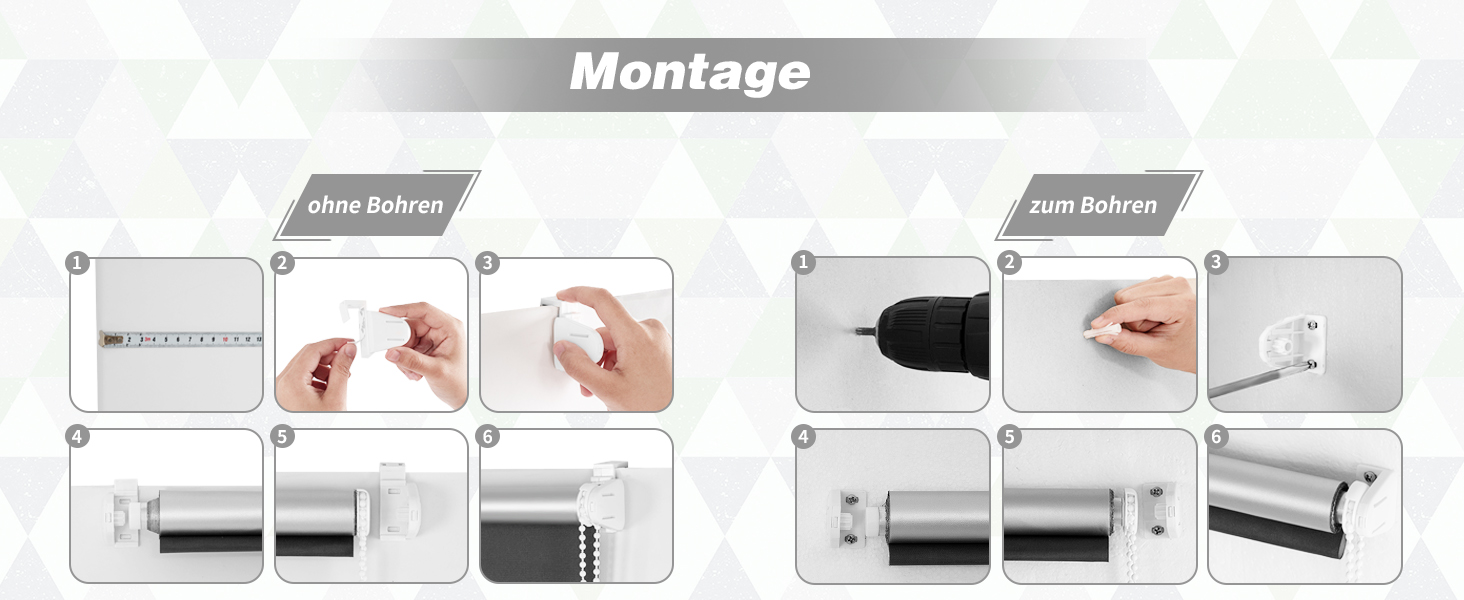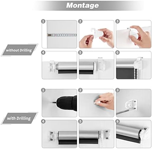 Die Montage ist kinderleicht und kann auf zwei verschiedene Arten erfolgen. Sie können das Rollo ohne Bohren installieren, indem Sie es mit Klammern im Fensterrahmen befestigen, was sich besonders für Fensterflügel mit einer Dicke von 1-2 cm eignet. Alternativ können Sie das Rollo auch mit Bohrungen an Wand oder Decke anbringen, indem Sie die mitgelieferten Schrauben verwenden. Wählen Sie die passende Montagemethode ganz nach Ihrem Bedarf.